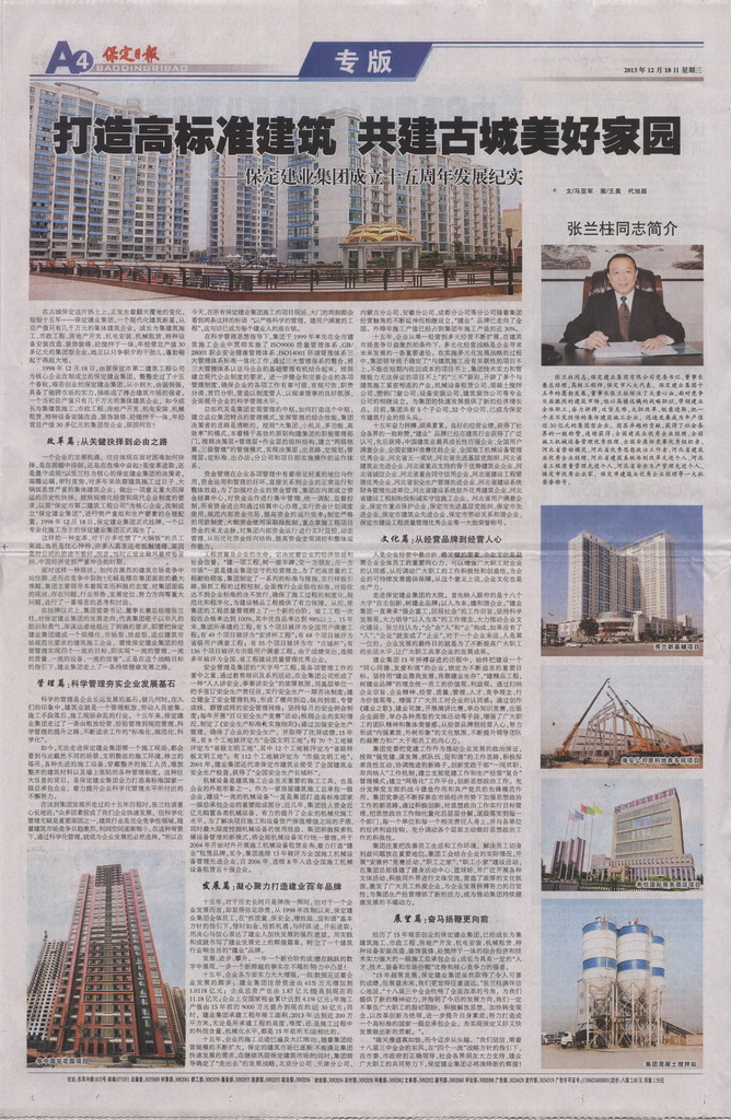 保定日報(bào)專版報(bào)道集團(tuán)公司成立十五周年